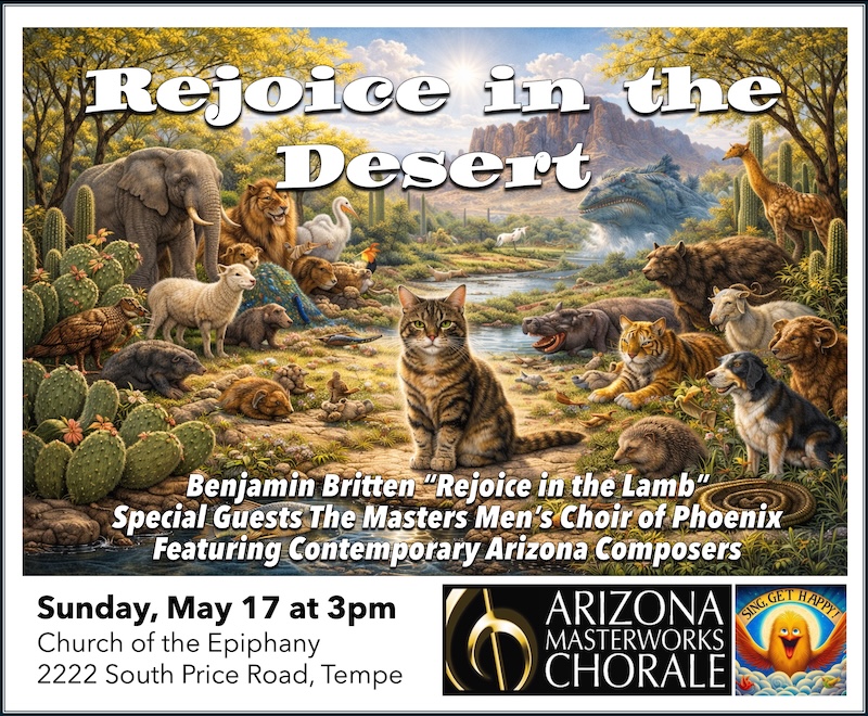The Arizona Masterworks Chorale season finale is a celebration of life in the Sonoran Desert, including Benjamin Britten’s “Neo-Classical” (1943) cantata Rejoice in the Lamb, a set from local guest artists the Masters Men’s Choir of Phoenix, and masterworks by contemporary Arizona composers Kira Zeeman Rugen, Michael Hegeman, Michael McCabe, Paul Sautter, and our own Darren Herring.